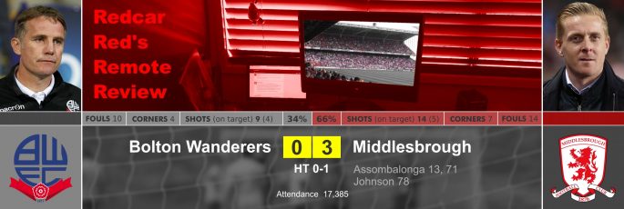 With three minutes of the ninety remaining on the clock Madine had a fierce shot brilliantly saved by Randolph to keep the all-important confidence boosting clean sheet.  That was all Bolton had in their locker as Boro fans “Ole’d” a serious of passes which almost resulted in a third for Britt. As soon as the 4th Official had put up the board to indicate three more additional minutes Assombalonga again went one on one with Alnwick who deflected his shot onto the far post.