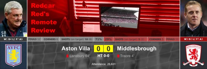 In the last minute of the first half Fabio gave away a free kick 25 yards out which Snodgrass delivered over the wall and spun dangerously off the turf in front of Randolph who needed a second grasp to ensure safety. Villa continued to lay siege to the Boro goal as the White and Blue shirted defenders valiantly repelled the Villains. Finally the Referee blew his whistle to end the half to a chorus of boos from the home fans and sighs of relief from the travelling Teesside away support.