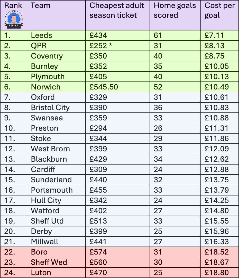 I suspect the price shown in the table reflects the rack rate, without any account taken of discount schemes, such as Boro's early bird price. Neither does the table indicate how many tickets are available at the listed price. Who knows, we might appear nearer the other end of the table that shows the average price for an adult season ticket.