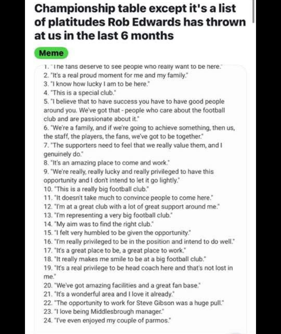 One of the things Edwards (or his coaching team?) did really well was to nurture and develop a strong team spirit. The new manager needs to maintain Boro’s determined will-to-win and resilience. It’s been a key element in our success to date.