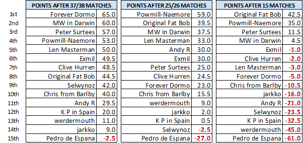 I am pleased to say that now, after 25/26 games played, things are looking a little better for most people than after the first 15 games. That said, no one is scoring remotely as well as at the similar stage of last season. At this stage last year it was Len who was racing ahead on 119.5 points, with Pedro, KP, Clive and Selwyn all in the 90s. In fact there were only three entries scoring below 50 (myself on 25.5, Exmil on 0 and FD’s randomly selected entry on minus 35).